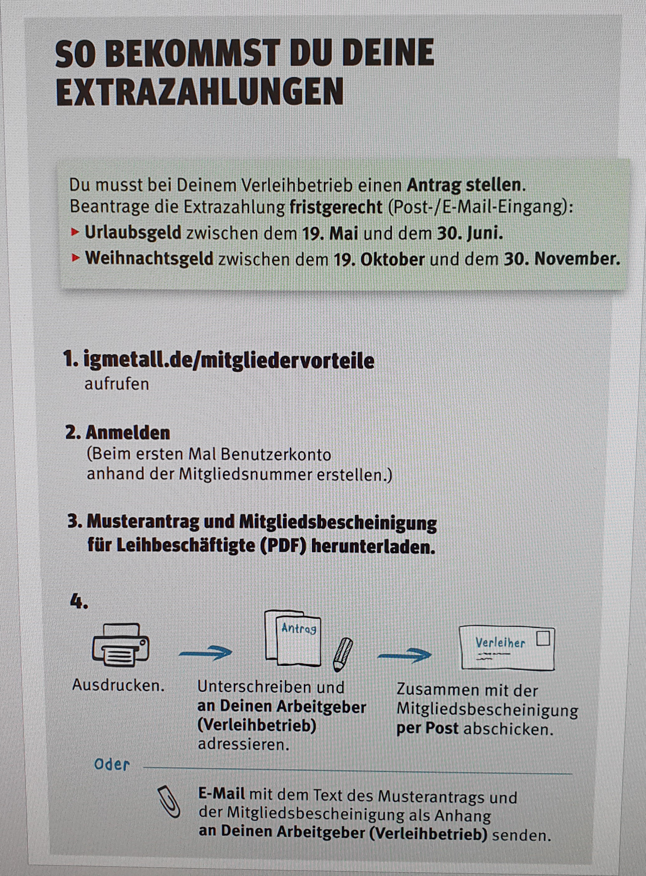 Deine Mitgliedschaft bei der IG Metall macht einen Unterschied – für Dich und für uns alle. Gemeinsam haben wir erreicht, dass Du als Leiharbeitnehmer*in Anspruch auf die Mitglieder-Extrazahlung zum Weihnachtsgeld hast. Wichtig ist, dass Du mindestens 6 Monate Mitglied bei uns und mehr als 6 Monate bei Deinem Verleiher tätig bist (Stichtag 30.11.2025).