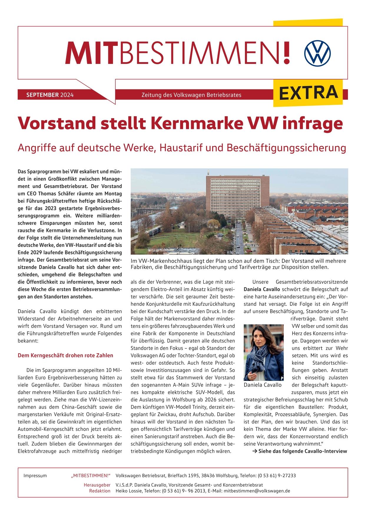Daniela Cavallo, Gesamtbetriebsratsvorsitzende der Volkswagen AG: „Der Vorstand hat versagt. Die Folge ist ein Angriff auf unsere Beschäftigung, Standorte und Tarifverträge. Damit steht VW selber und somit das Herz des Konzerns infrage. Dagegen werden wir uns erbittert zur Wehr setzen. Mit uns wird es keine Standortschließungen geben. Anstatt sich einseitig zulasten der Belegschaft kaputtzusparen, muss jetzt ein strategischer Befreiungsschlag her mit Schub für die eigentlichen Baustellen: Produkt, Komplexität, Prozessabläufe, Synergien. Das ist der Plan, den wir brauchen. Und das ist kein Thema der Marke VW alleine. Hier fordern wir, dass der Konzernvorstand endlich seine Verantwortung wahrnimmt.“