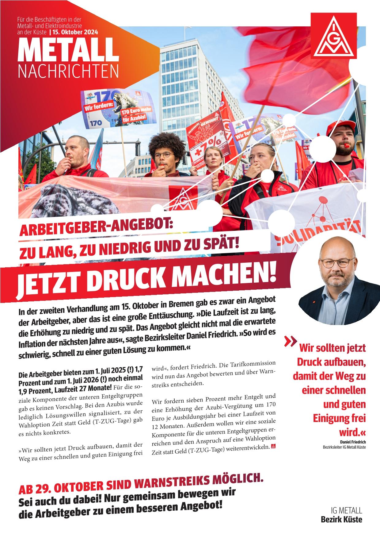 Hier findest du unsere Flugblätter, die in unserem Bezirk ausgeteilt wurden. Hier hast du einen schnellen Überblick, was in der Metall und Elektro-Tarifbewegung 2024 wichtiges passiert ist.