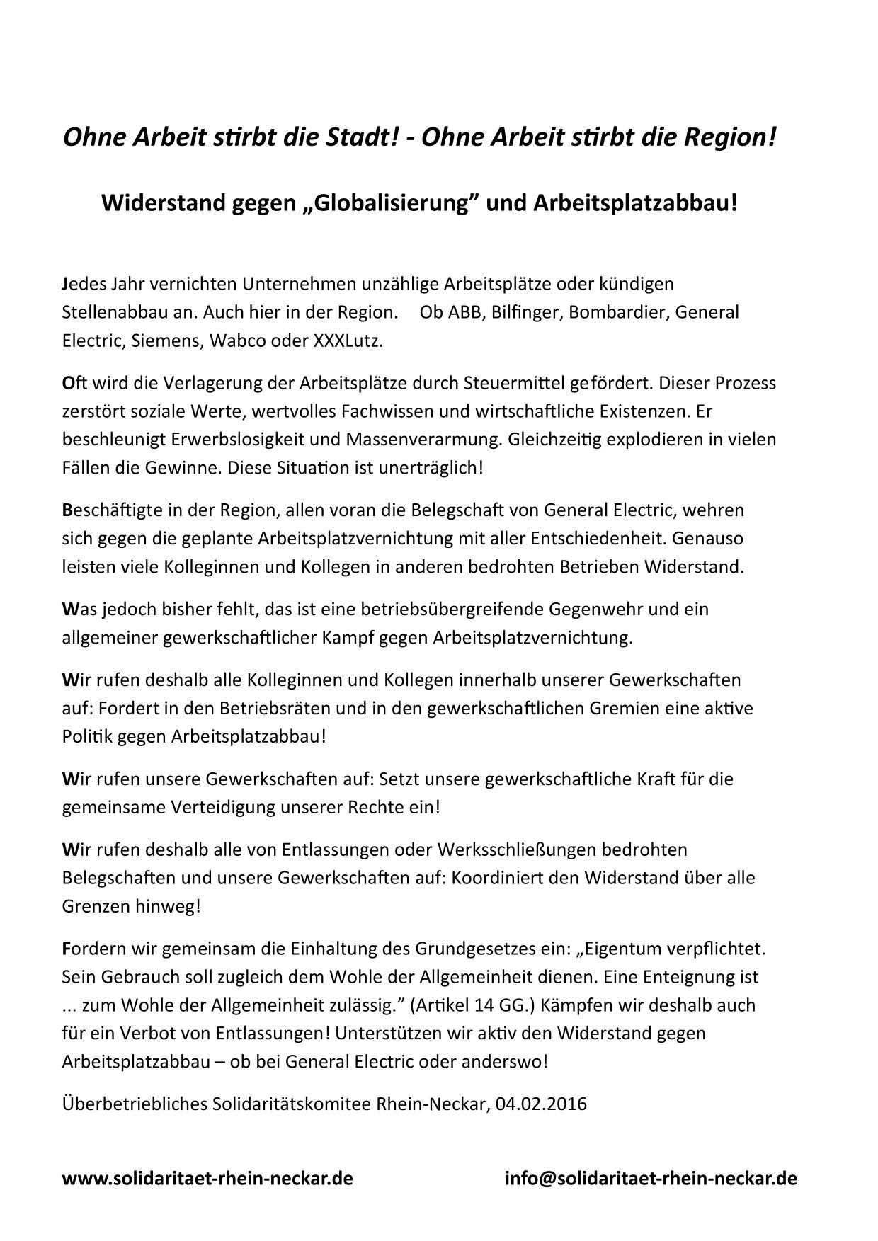 Mit dem seinerzeit verabschiedeten Appell „Ohne Arbeit stirbt die Stadt! - Ohne Arbeit stirbt die Region!“ wird zum „Widerstand gegen ‚Globalisierung‘ und Arbeitsplatzabbau!“ aufgerufen (Text im Anhang).