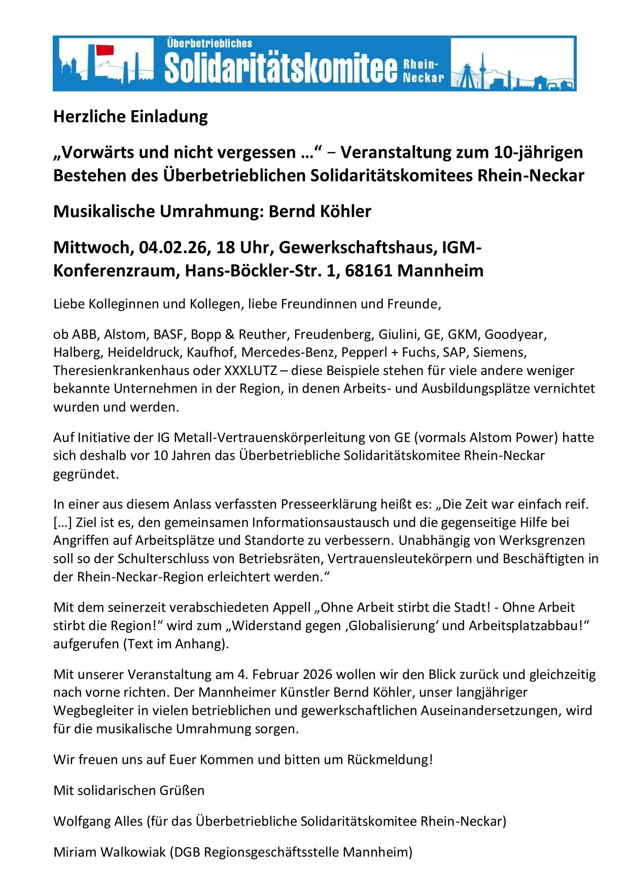 Auf Initiative der IG Metall-Vertrauenskörperleitung von GE (vormals Alstom Power) hatte sich deshalb vor 10 Jahren das Überbetriebliche Solidaritätskomitee Rhein-Neckar gegründet.