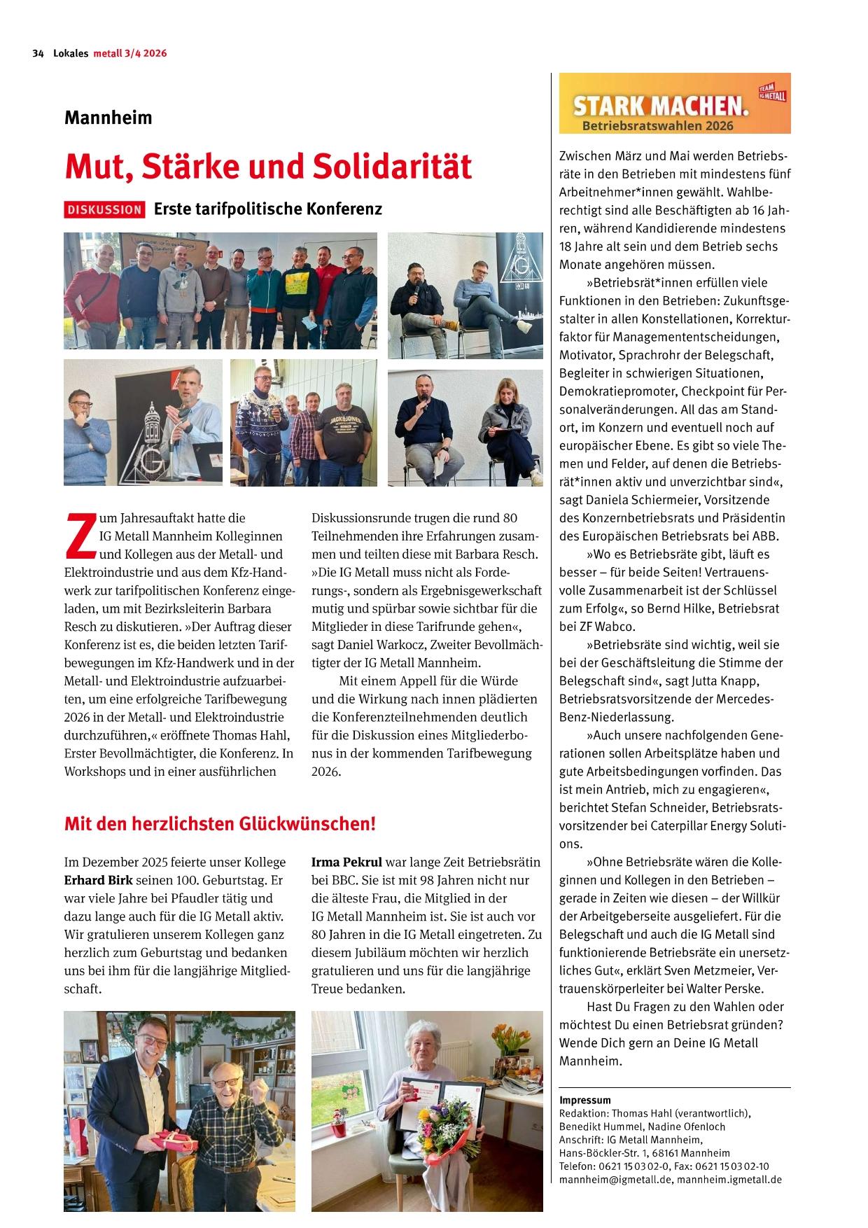Das Mitgliedermagazin "metall" erscheint regelmäßig und bietet interessante Artikel zu betrieblichen Themen, Neues aus der Rechtsprechung, Informationen zur Tarifpolitik, News aus dem Bezirk und aus der Geschäftsstelle Mannheim. Hier könnt ihr Einblick in die Lokalseite nehmen.