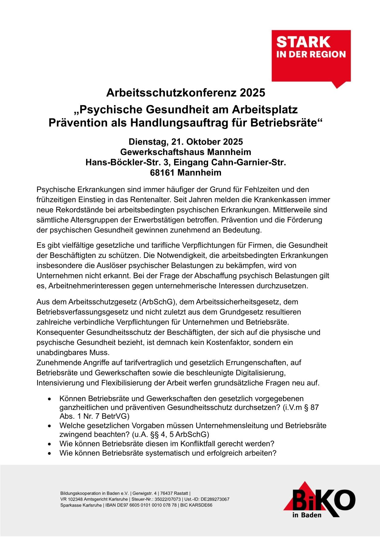 Arbeitsschutzkonferenz 2025 „Psychische Gesundheit am Arbeitsplatz Prävention als Handlungsauftrag für Betriebsräte“ am Dienstag, den 21. Oktober 2025