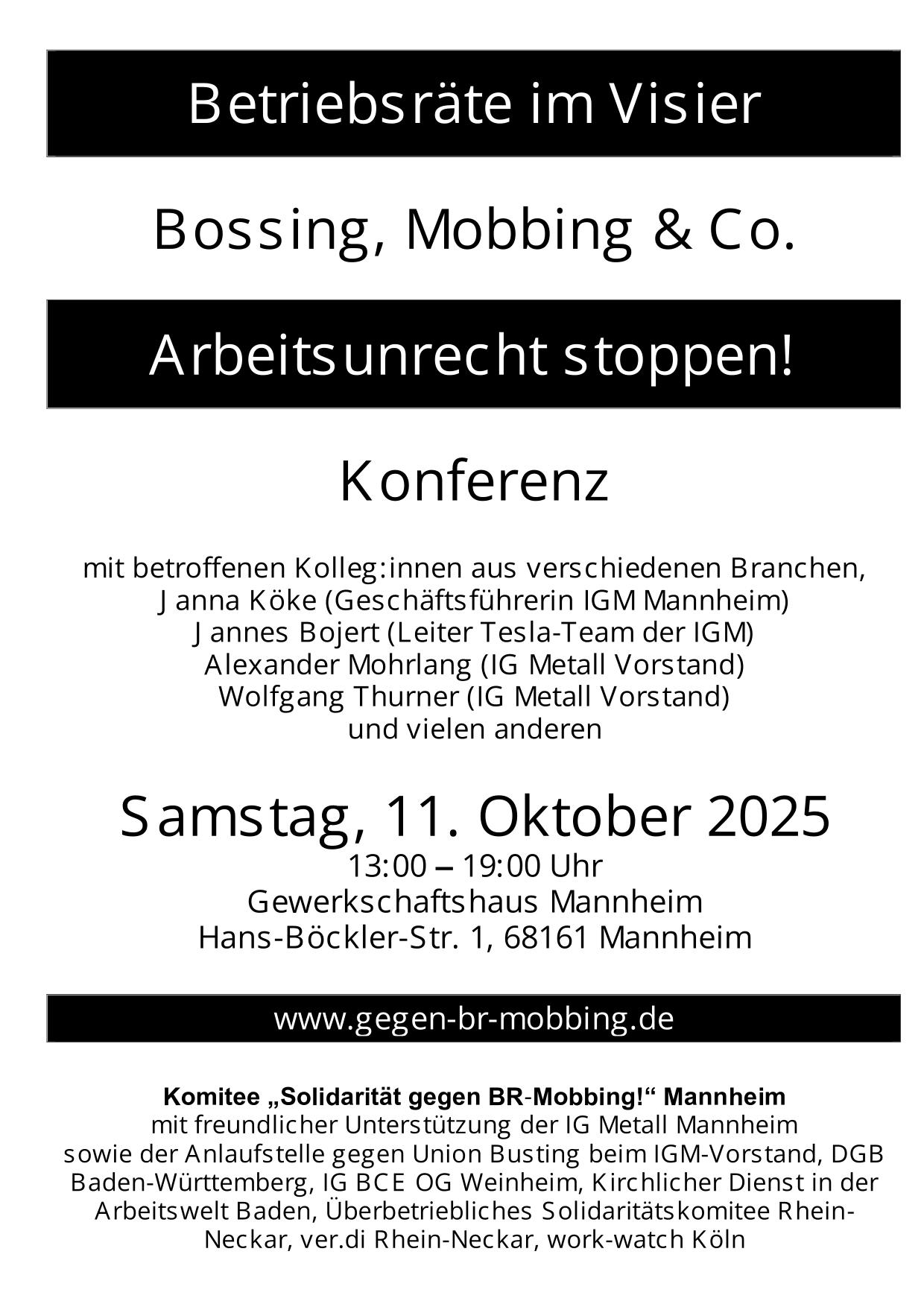 12. Bundeskonferenz „Betriebsräte im Visier - Arbeitsunrecht stoppen!“ am Samstag, den 11.10.2025, ab 13:00 Uhr im Mannheimer Gewerkschaftshaus